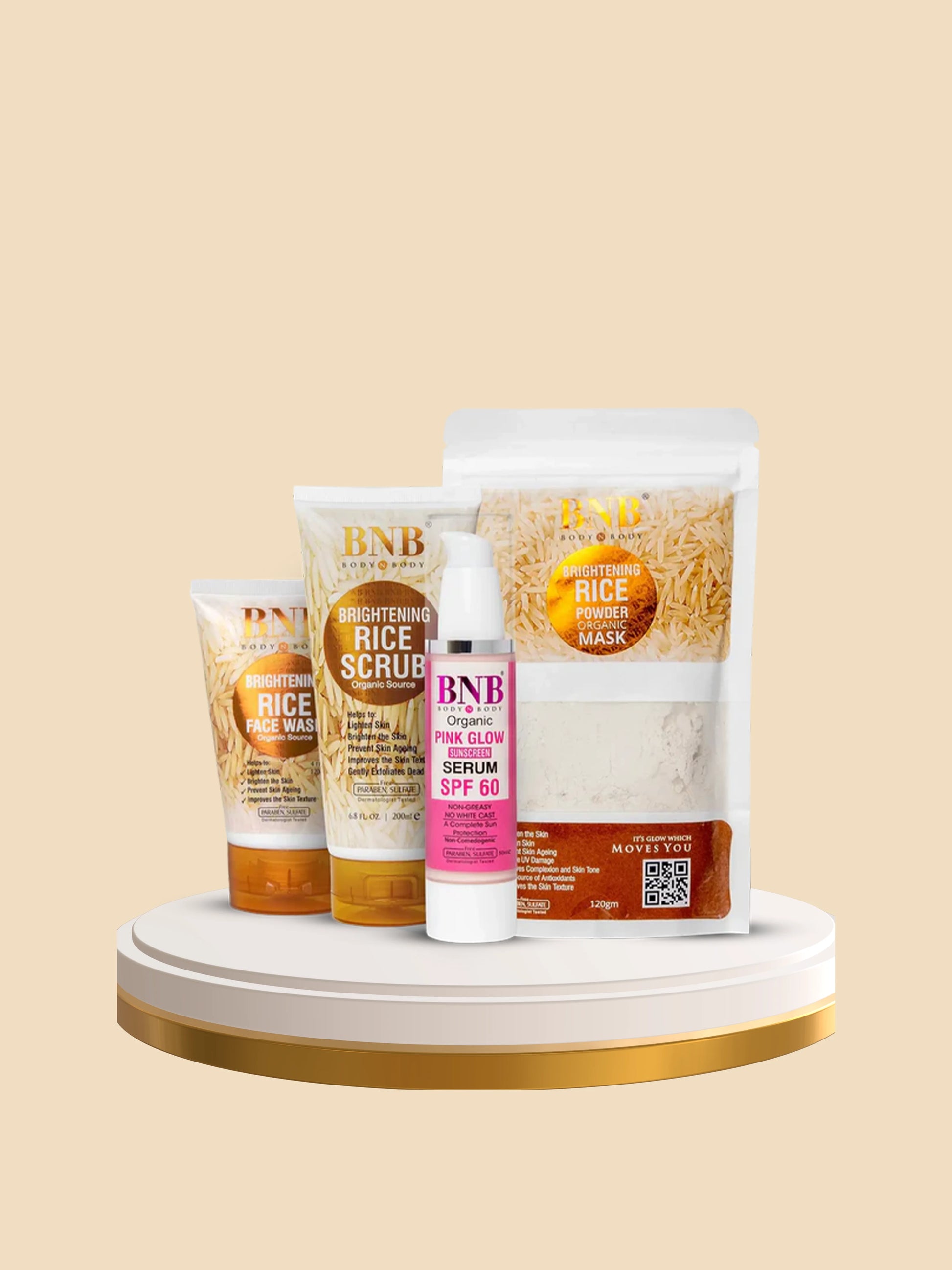 Start by cleansing your face with the Rice Extract Facewash, then exfoliate with the Rice Scrub. Follow up with the Rice Face Mask for deep nourishment and brightness. Finally, apply the Pink Glow SPF to protect your skin from harmful UV rays while boosting its natural glow.